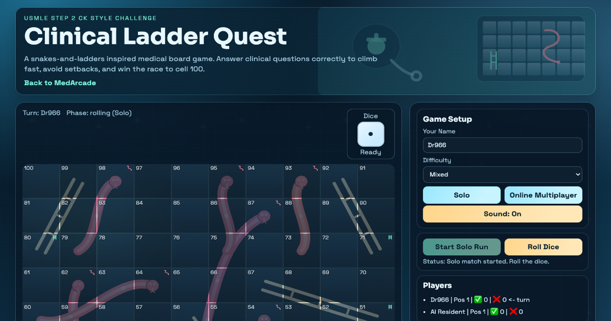 A snakes-and-ladders inspired medical board game. Answer clinical questions correctly to climb fast, avoid setbacks, and win the race to cell 100.